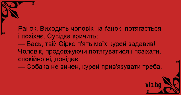— Вась, твій Сірко п'ять моїх курей задавив!
