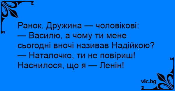 — Василю, а чому ти мене сьогодні вночі називав Надійкою?