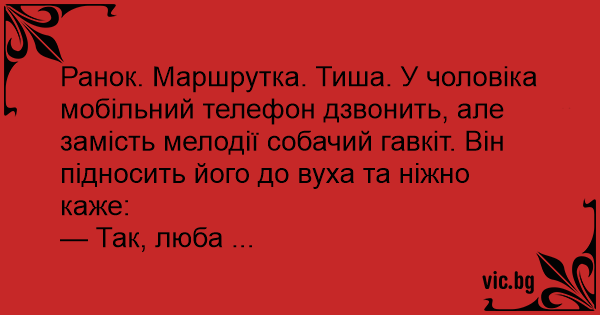 Ранок. Маршрутка. Тиша. У чоловіка мобільний телефон дзвонить, але замість мелодії собачий гавкіт. Він підносить його до вуха та ніжно каже: