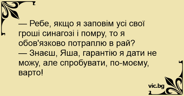 — Ребе, якщо я заповім усі свої гроші синагозі і помру, то я обов'язково потраплю в рай?