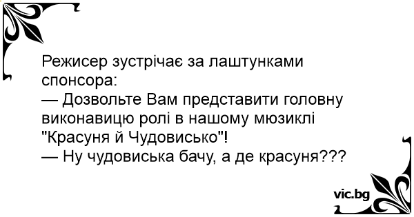 — Дозвольте Вам представити головну виконавицю ролі в нашому мюзиклі "Красуня й Чудовисько"!
