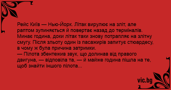 Рейс Київ — Нью-Йорк. Літак вирулює на зліт, але раптом зупиняється й повертає назад до терміналів. Минає година, доки літак таки знову потрапляє на злітну смугу. Після зльоту один із пасажирів запитує стюардесу, в чому ж була причина затримки.