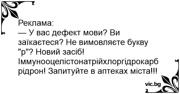 — У вас дефект мови? Ви заїкаєтеся? Не вимовляєте букву "р"? Новий засіб! Іммунооцелістонатрійхлоргідрокарбрідрон! Запитуйте в аптеках міста!!!