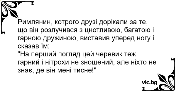 Римлянин, котрого друзі дорікали за те, що він розлучився з цнотливою, багатою і гарною дружиною, виставив уперед ногу і сказав їм: