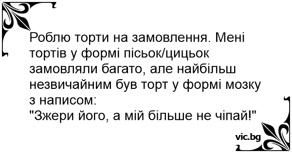 Роблю торти на замовлення. Мені тортів у формі пісьок/цицьок замовляли багато, але найбільш незвичайним був торт у формі мозку з написом: