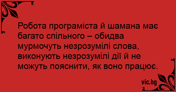 Робота програміста й шамана має багато спільного – обидва мурмочуть незрозумілі слова, виконують незрозумілі дії й не можуть пояснити, як воно працює.