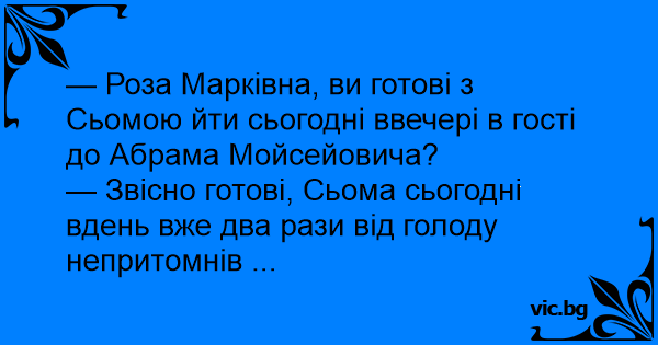 — Роза Марківна, ви готові з Сьомою йти сьогодні ввечері в гості до Абрама Мойсейовича?