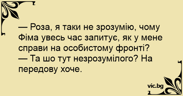 — Роза, я таки не зрозумію, чому Фіма увесь час запитує, як у мене справи на особистому фронті?