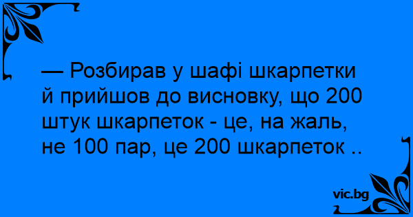 — Розбирав у шафі шкарпетки й прийшов до висновку, що 200 штук шкарпеток - це, на жаль, не 100 пар, це 200 шкарпеток ..