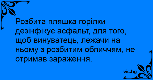 Розбита пляшка горілки дезінфікує асфальт, для того, щоб винуватець, лежачи на ньому з розбитим обличчям, не отримав зараження.