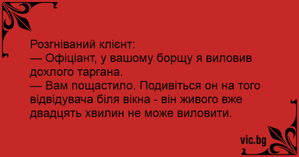 — Офіціант, у вашому борщу я виловив дохлого таргана.