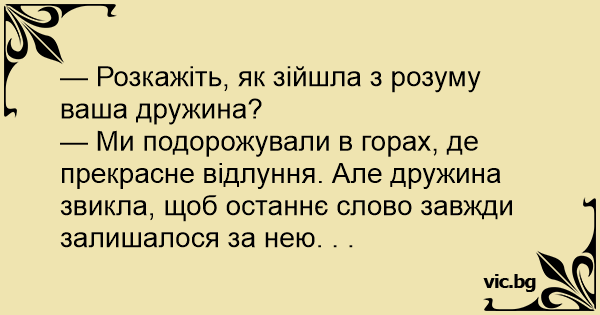 — Ми подорожували в горах, де прекрасне відлуння. Але дружина звикла, щоб останнє слово завжди залишалося за нею. . .