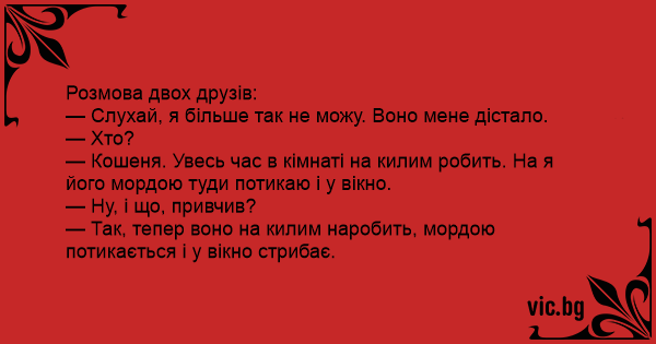 — Кошеня. Увесь час в кімнаті на килим робить. На я його мордою туди потикаю і у вікно.