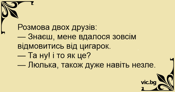— Знаєш, мене вдалося зовсім відмовитись від цигарок.
