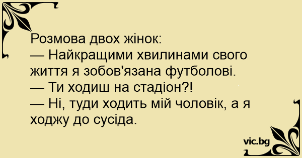 Сусідки: — Ти знаєш, Маріє, найкращими моментами в своєму житті я завдячую футболу. — Наталю, невже ти ходиш на стадіон уболівати за "Динамо"? — Ні, туди ходить мій чоловік, а я під цей час ходжу...