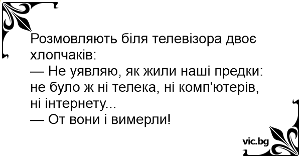 — Не уявляю, як жили наші предки: не було ж ні телека, ні комп'ютерів, ні інтернету...