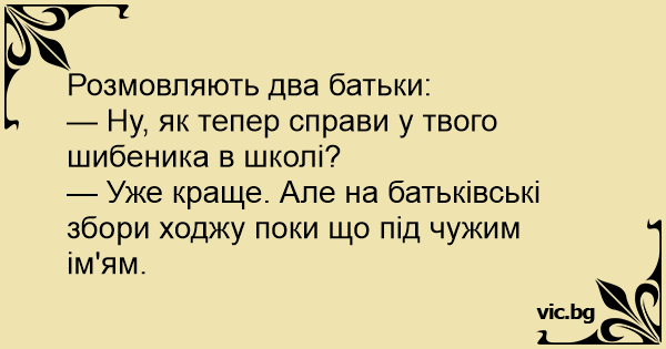 Розмовляють два батьки:<br />— Ну, як тепер справи у твого шибеника в школі?<br />— Уже краще. Але на батьківські збори ходжу поки що під чужим ім'ям.