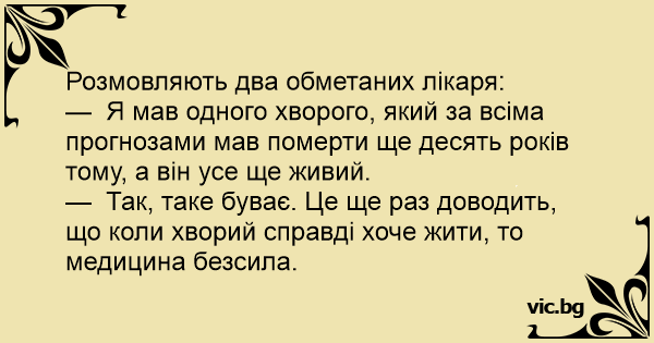 —  Я мав одного хворого, який за всіма прогнозами мав померти ще десять років тому, а він усе ще живий.