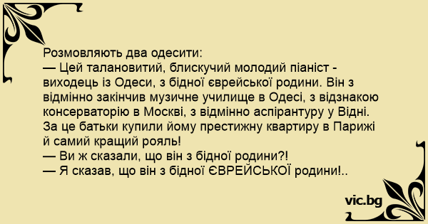 — Цей талановитий, блискучий молодий піаніст - виходець із Одеси, з бідної єврейської родини. Він з відмінно закінчив музичне училище в Одесі, з відзнакою консерваторію в Москві, з відмінно аспірантуру у Відні. За це батьки купили йому престижну квартиру в Парижі й самий кращий рояль!