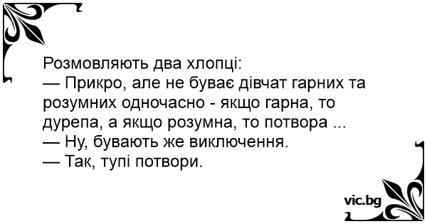 — Прикро, але не буває дівчат гарних та розумних одночасно - якщо гарна, то дурепа, а якщо розумна, то потвора ...