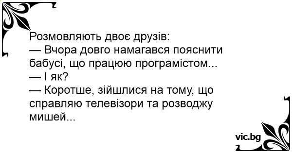 — Вчора довго намагався пояснити бабусі, що працюю програмістом...