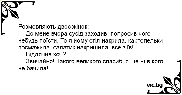 — До мене вчора сусід заходив, попросив чого-небудь поїсти. То я йому стіл накрила, картопельки посмажила, салатик накришила, все з’їв!