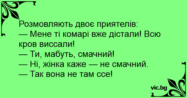 — Мене ті комарі вже дістали! Всю кров виссали!