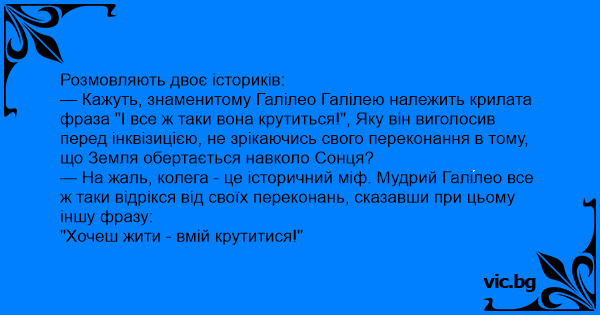 — На жаль, колега - це історичний міф. Мудрий Галілео все ж таки відрікся від своїх переконань, сказавши при цьому іншу фразу:
