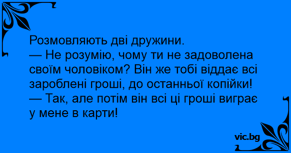 — Не розумію, чому ти не задоволена своїм чоловіком? Він же тобі віддає всі зароблені гроші, до останньої копійки!