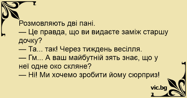 — Гм... А ваш майбутній зять знає, що у неї одне око скляне?