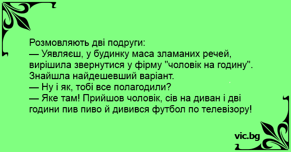 — Уявляєш, у будинку маса зламаних речей, вирішила звернутися у фірму "чоловік на годину". Знайшла найдешевший варіант.