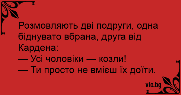 Розмовляють дві подруги, одна біднувато вбрана, друга від Кардена: