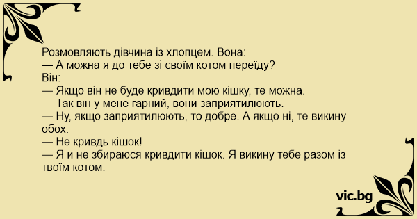 — Я и не збираюся кривдити кішок. Я викину тебе разом із твоїм котом.