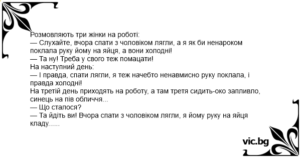 — Та йдіть ви! Вчора спати з чоловіком лягли, я йому руку на яйця кладу... і кажу: