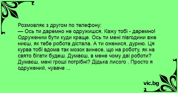 — Ось ти даремно не одружишся. Кажу тобі - даремно! Одруженим бути куди краще. Ось ти мені півгодини вже ниєш, як тебе робота дістала. А ти оженися, дурню. Ця kуpba тобі вдома так мозок винесе, що на роботу, як на свято бігати будеш. Думаєш, в мене чому дві роботи? Думаєш, мені гроші потрібні? Дідька лисого . Просто я одружений, чуваче ...