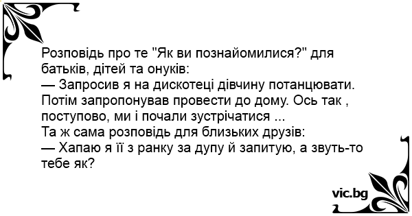 — Хапаю я її з ранку за дупу й запитую, а звуть-то тебе як?