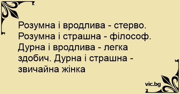 Розумна і вродлива - стерво. Розумна і страшна - філософ. Дурна і вродлива - легка здобич. Дурна і страшна - звичайна жінка