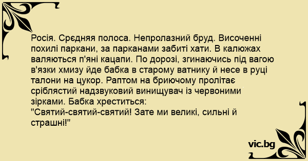Росія. Срєдняя полоса. Непролазний бруд. Височенні похилі паркани, за парканами забиті хати. В калюжах валяються п'яні кацапи. По дорозі, згинаючись під вагою в'язки хмизу йде бабка в старому ватнику й несе в руці талони на цукор. Раптом на бриючому пролітає сріблястий надзвуковий винищувач із червоними зірками. Бабка хреститься: