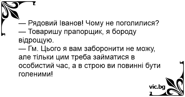 — Гм. Цього я вам заборонити не можу, але тільки цим треба займатися в особистий час, а в строю ви повинні бути голеними!