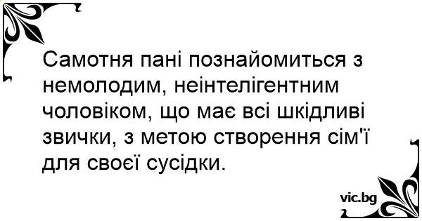 Самотня пані познайомиться з немолодим, неінтелігентним чоловіком, що має всі шкідливі звички, з метою створення сім'ї для своєї сусідки.