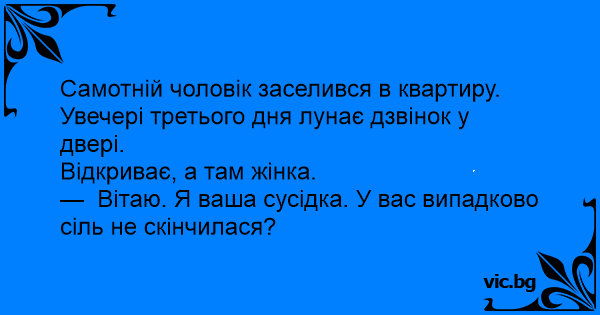 — Вітаю. Я ваша сусідка. У вас випадково сіль не скінчилася?
