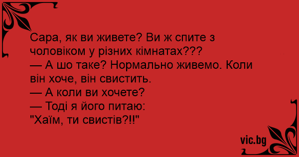 - Hogyan éltek házaséletet, ha külön szobában alusztok? - érdeklődik a barátnő. - Ez nálunk igen egyszerűen megy, a férjem füttyent egyet, ha kedve van hozzá. - És, ha neked támad kedved? - Akkor...