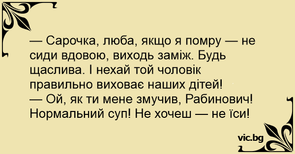— Сарочка, люба, якщо я помру — не сиди вдовою, виходь заміж. Будь щаслива. І нехай той чоловік правильно виховає наших дітей!<br />— Ой, як ти мене змучив, Рабинович! Нормальний суп! Не хочеш — не їси!