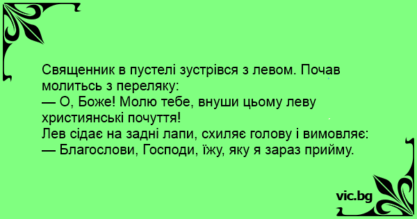 У пустелі на місіонера напав лев. Місіонер благає: — Господи, вклади в душу цьому звірові християнські почуття! Раптом лев піднімає очі до неба і каже: — Господи, благослови їжу, яку я зараз прийму!