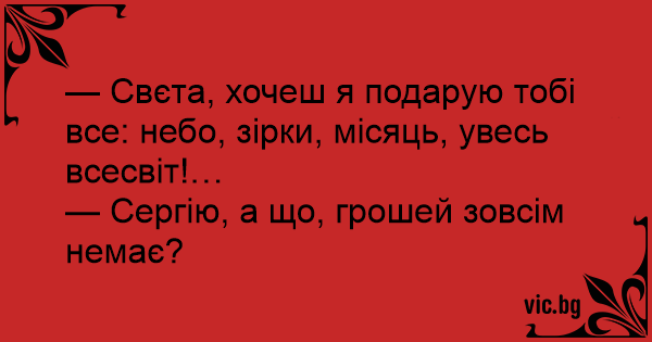 — Свєта, хочеш я подарую тобі все: небо, зірки, місяць, увесь всесвіт!…