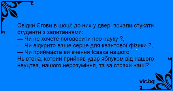 — Чи приймаєте ви вчення Ісаака нашого Ньютона, котрий прийняв удар яблуком від нашого неуцтва, нашого нерозуміння, та за страхи наші?