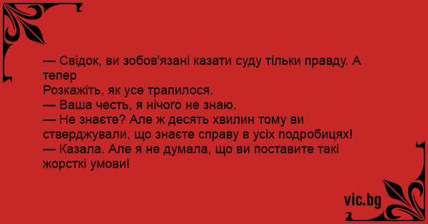 — Свідок, ви зобов'язані казати суду тільки правду. А тепер