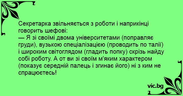 — Я зі своїмі двома університетами (поправляє груди), вузькою спеціалізацією (проводить по талії) і широким світоглядом (гладить попку) скрізь найду собі роботу. А от ви зі своїм м'яким характером (показує середній палець і згинає його) ні з ким не спрацюєтесь!