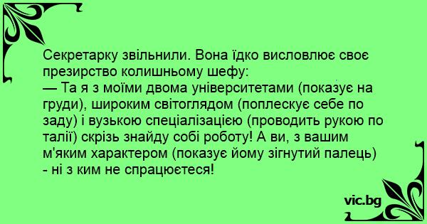 — Та я з моїми двома університетами (показує на груди), широким світоглядом (поплескує себе по заду) і вузькою спеціалізацією (проводить рукою по талії) скрізь знайду собі роботу! А ви, з вашим м'яким характером (показує йому зігнутий палець) - ні з ким не спрацюєтеся!