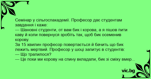 — Шановні студенти, от вам бик і корова, а я пішов пити каву й коли повернуся зробіть так, щоб бик осеменив корову.